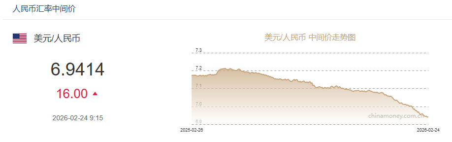 2月24日人民币对美元中间价报6.9414元 下调16个基点